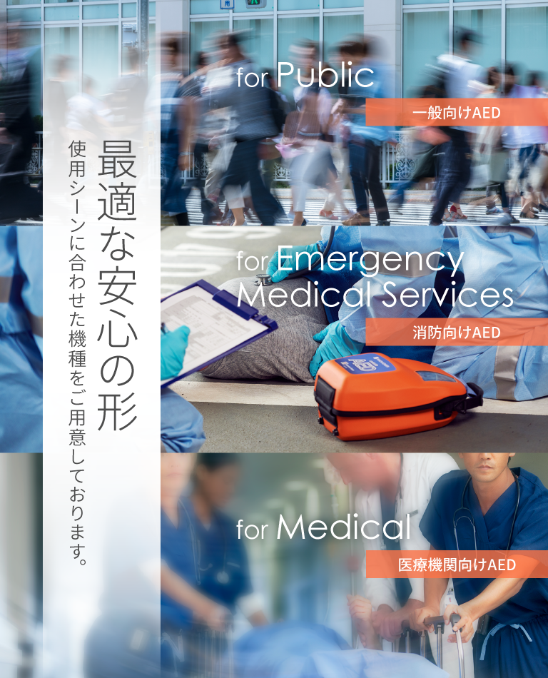 日本光電のAEDの豊富なラインナップ、機能、特長、導入フロー、設置事例など、AEDの導入を検討されているお客様向けの情報をご紹介しています。